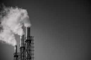 three smoking pipes of a plant against the sky. The concept of e